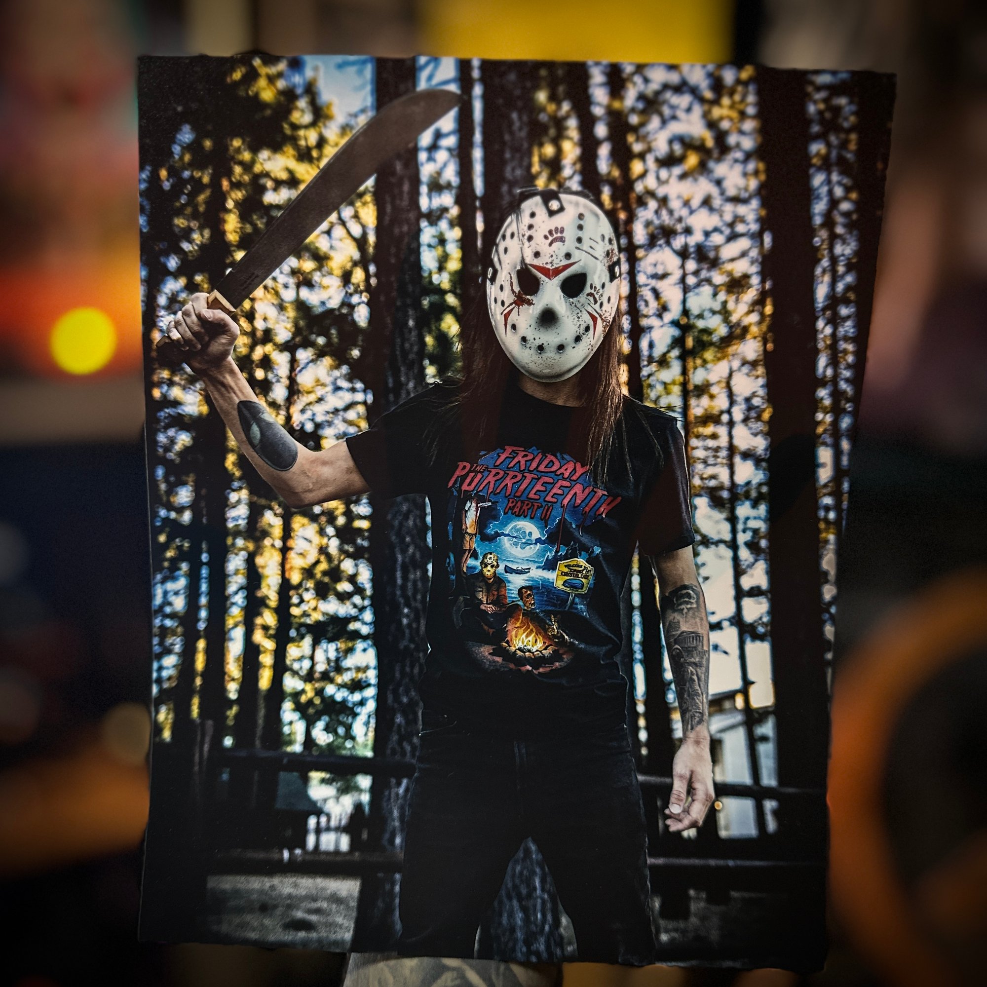 8x10 satin print of Miles in the Friday the Purrteenth Mask with the Friday the Purrteenth Part II tee.